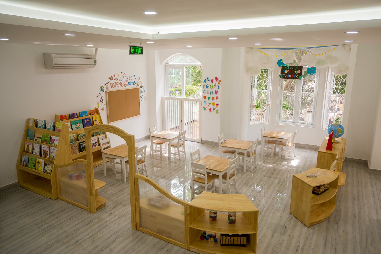 An toàn và do chính các bé làm chủ: Phòng học đầy đủ ánh sáng tự nhiên vào ban ngày và ánh sáng đèn vào ban đêm. Kích thước bàn ghế, vật dụng được thiết kế phù hợp với chiều cao của bé, trần nhà được hạ thấp bởi những đám mây, quả khinh khí cầu thả xuống... để bé có cảm giác gần gũi. Mỗi ngày học có một giờ mà con được tự chọn một góc hoạt động mà bé ưa thích.